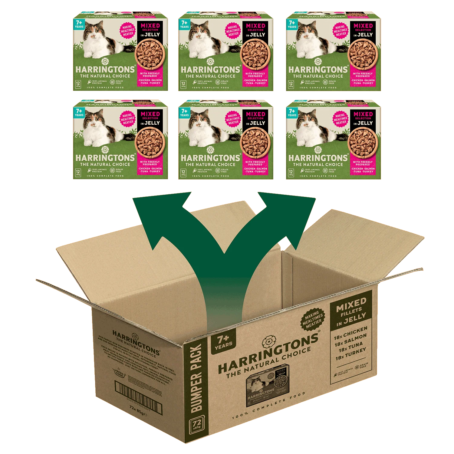 Introducing Harringtons Mixed Selection in Jelly Senior Complete Wet Cat Food Pouches ā the perfect blend of variety and nutrition for your senior feline companion. Specially crafted for cats aged 7 and above, this mouth-watering wet cat food offers a mix of delicious and nutritious meals made with freshly prepared meat and fish ingredients set in a delectable jelly.