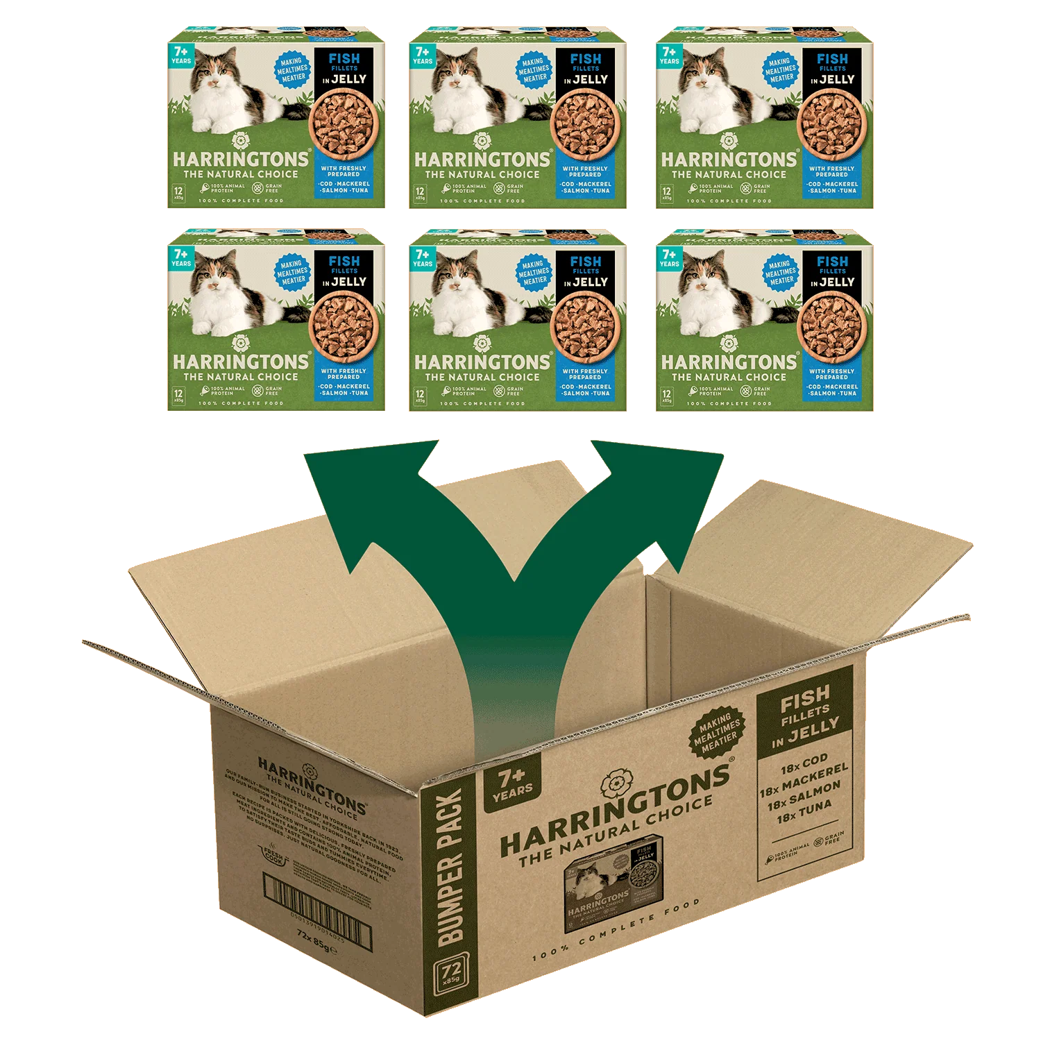 Introducing Harringtons Fish Selection in Jelly Senior Complete Wet Cat Food ā the natural choice for your feline friend's golden years. Specially formulated for senior cats, this delicious, grain-free wet cat food offers a mouth-watering variety of freshly prepared fish ingredients, including four different types of fish for a taste your cat will adore.