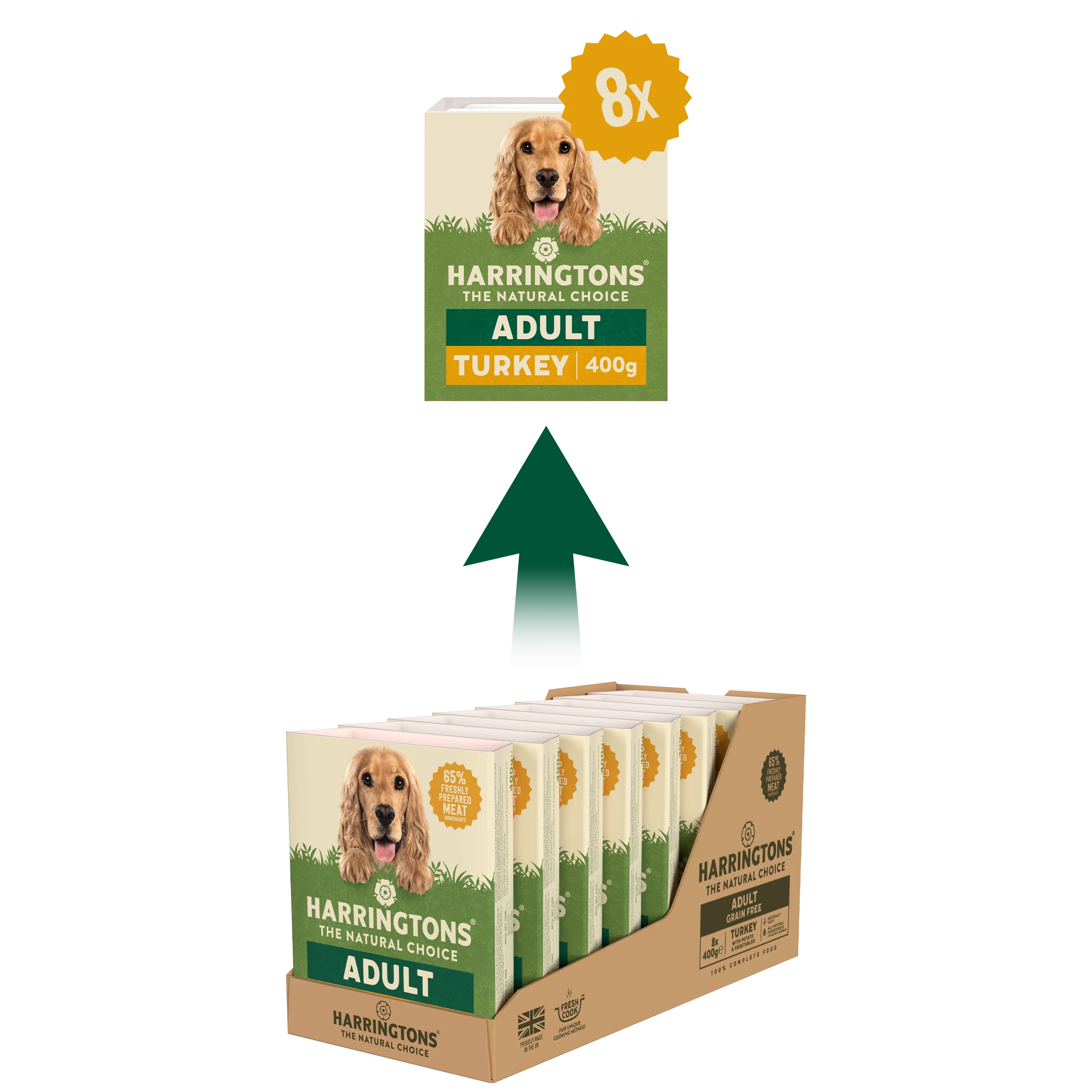 Now packed with 90% freshly prepared meat ingredients & veg, these delicious grain-free dinners can be enjoyed as a nourishing complete meal or mixed with Harringtons Dry Dog Food as a tasty topper for Hungry DogsĀ
